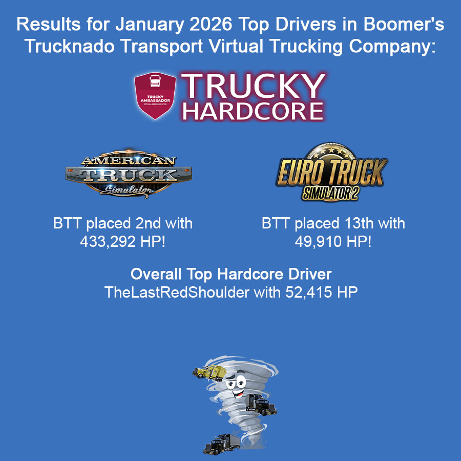 Boomer’s Trucknado Transport Virtual Trucking Company had a great month in January 2026, especially in American Truck Simulator!