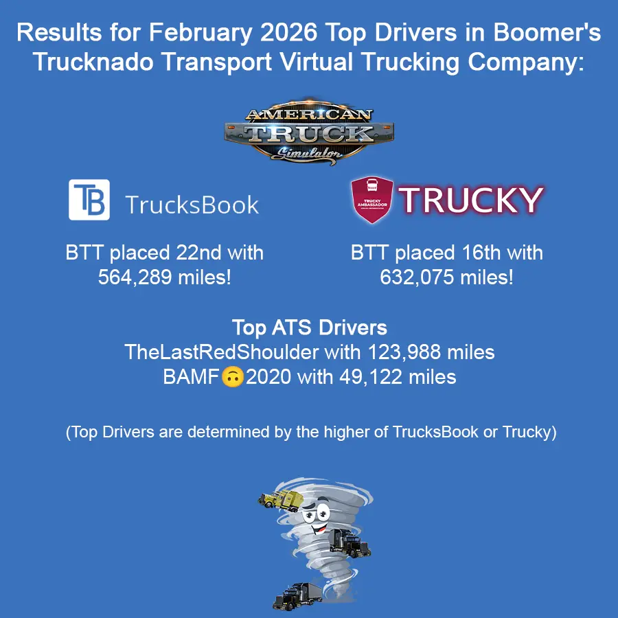 Boomer’s Trucknado Transport Virtual Trucking Company (BTT VTC) had a great month in February 2026, especially in Euro Truck Simulator 2 which was our focus in February!